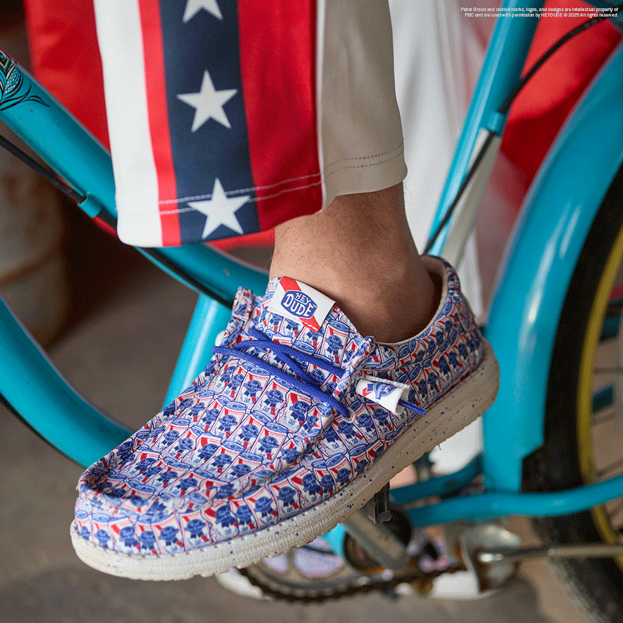 A toast to the ones who bring the cold ones. The backyard heroes of the hangout. Meet the official shoe of the beer run. HEYDUDE x Pabst Blue Ribbon is here with a limited-edition print. can tassels and signature. lightweight comfort C just in time for summer. All hail the blue ribbon.